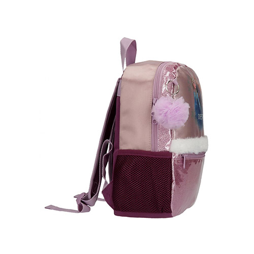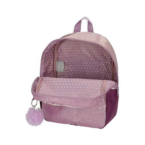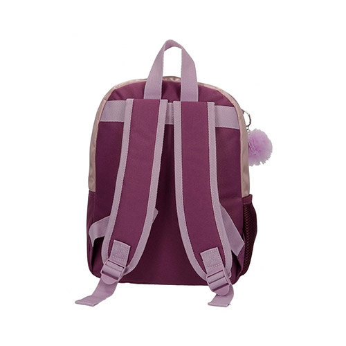 Ruksak izrađen od poliestera, ukrašen bijelom, mekanom vunom. Bočni džep i prednji džep za spremanje boce s vodom, sitnim dodacima i ručkom. Široke i podesive trake koje se savršeno uklapaju na stražnju stranu. Pompom privjesak za ključeve koji dopunjuje dizajn.