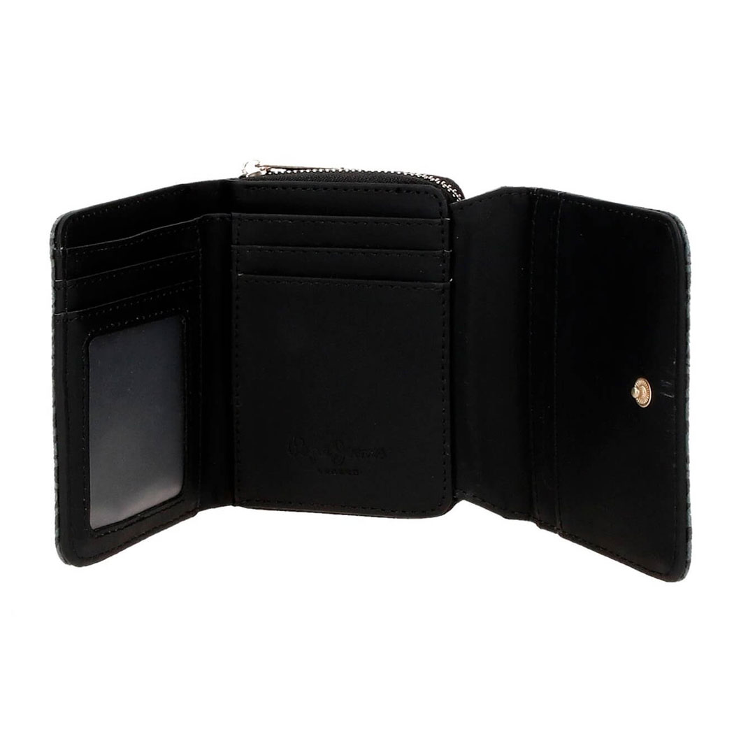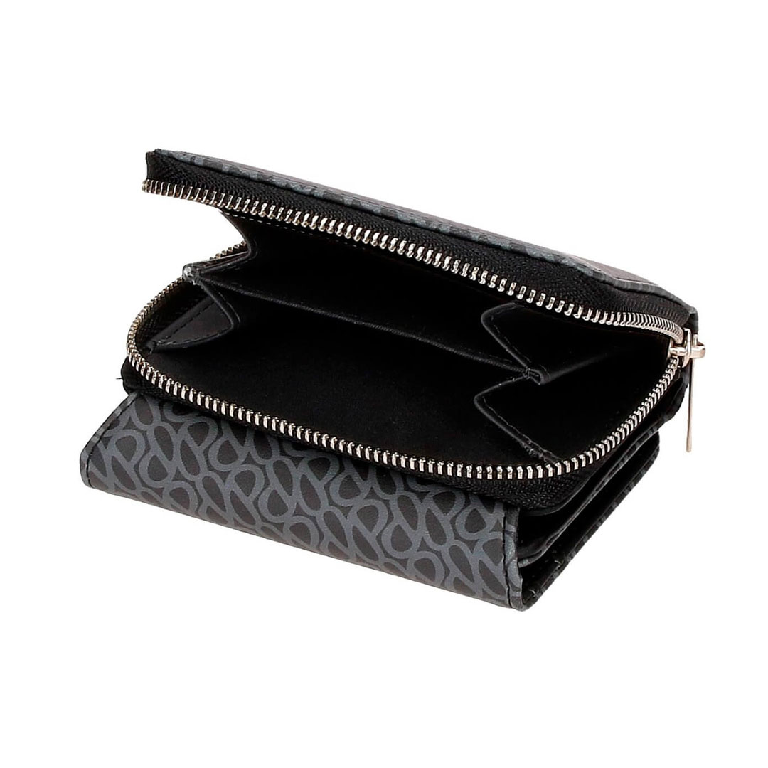 Novčanik od sintetičke kože 10 cm x 8 cm x 3 cm. Preklop sa kopčanjem na klik i torbica sa patent zatvaračem. Šest utora za kartice, providni pretinac za identifikaciju i poseban prostor za odlaganje novčanica. Specijalni sistem zaštite za RFID kartice koji blokira signale sa neovlašćenih uređaja za skeniranje radio frekvencija. Dimenzija: 8x10x3 cm.