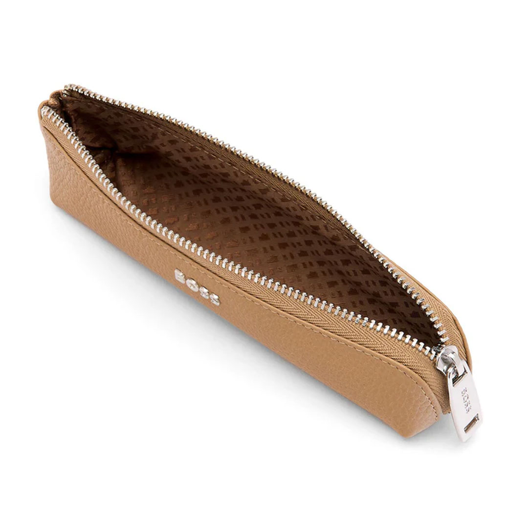 Hugo Boss mala torbica za olovke u klasičnoj zrnatoj kameli—savršena fuzija elegancije i funkcionalnosti za modernog profesionalca. Njegove elegantne dimenzije od 165 x 30 x 40 mm čine ga savršenim pratiocem vašeg omiljenog instrumenta za pisanje, osiguravajući i zaštitu i stil. Težina (g): 34. Sastav: 85% goveđa koža,10% poliester,5% posrebreno.