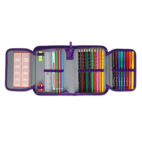 Poliester materijal, 1 zip, 28 djelova, unutrašnjost čine: gumica, oštrilo, 3 olovke, 10 bojica, trokut i linijar, 8 flomastera, raspored časova, lični podaci.