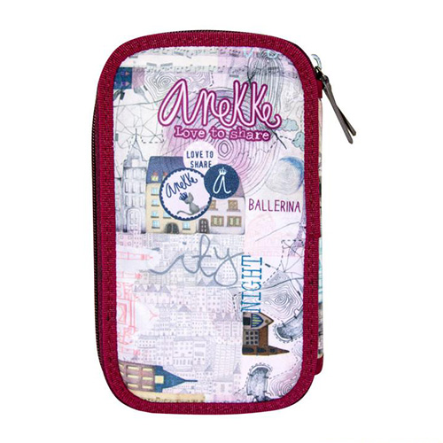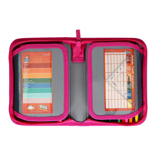 Unutrašnjost čine:gumica, oštrilo, 3 olovke, 10 bojica, trokut i linijar, 8 flomastera, raspored časova, lični podaci.