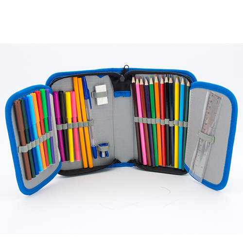 Pernica sadrži: 12 drvenih boja, 12 flomastera, zarezač, gumicu, lenjir, 2 grafitne olovke i hemijsku olovku.