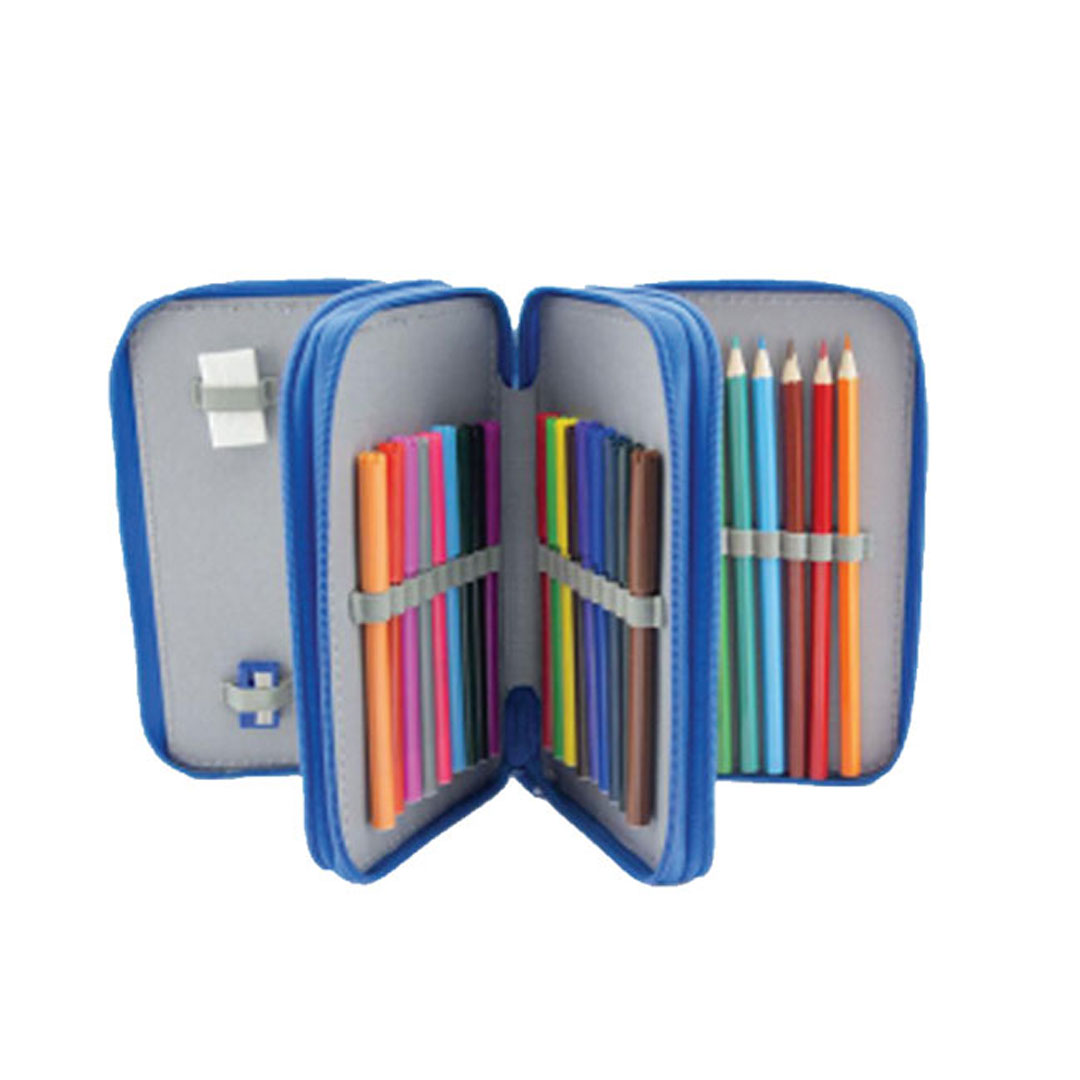 Pernica puna 3 zipa. Dimenzija 19.5x 12.5 x 6 cm. Sadrži tri zipa. Izrađena je od materijala 600D. Pernica sadrži: 18 drvenih boja; 18 flomastera; zarezač; gumicu; hemijsku olovku; lenjir; 2 grafitne olovke.