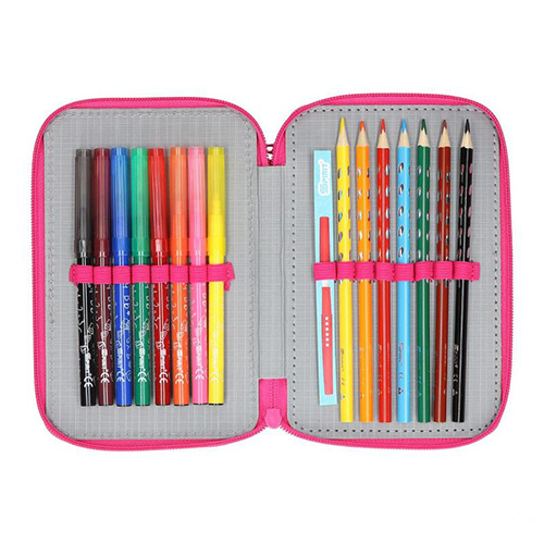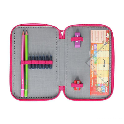 Unutrašnjost čine:gumica, oštrilo, 2 olovke, 7 bojica, trokut i linijar, 8 flomastera, 7 patrona tinte, raspored časova, lični podaci.
