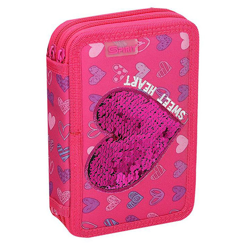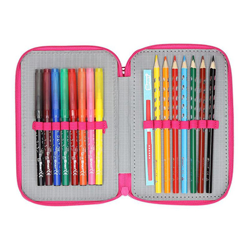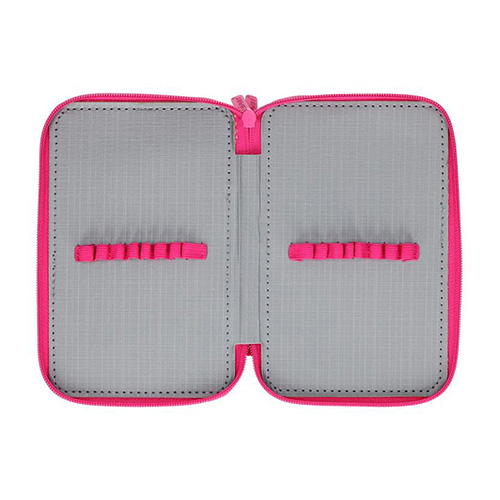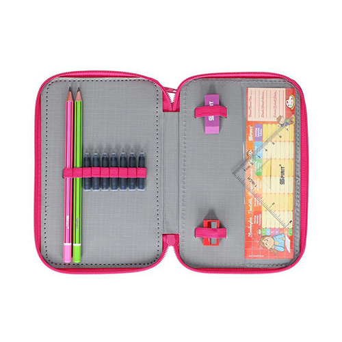 Poliester materijal, 1 zip, 28 djelova, unutrašnjost čine: gumica, oštrilo, 2 olovke, 7 bojica, trokut i linijar, 8 flomastera, 7 patrona tinte, raspored časova, lični podaci.