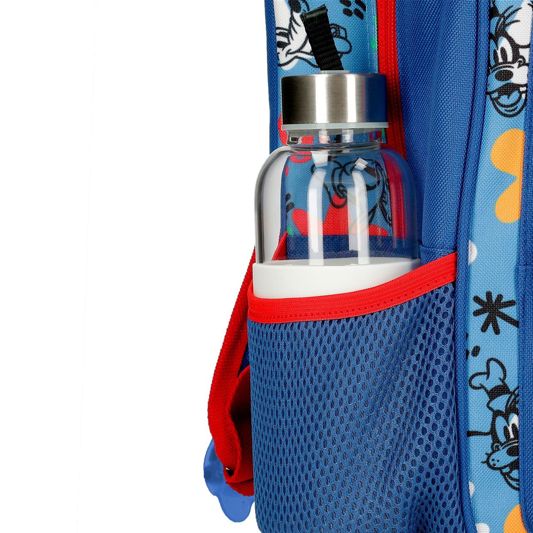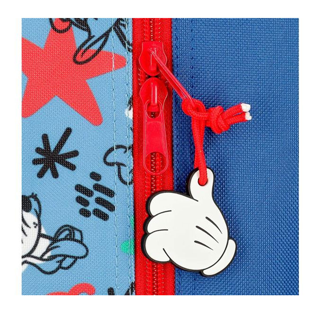 Ruksak je napravljen od izdržljivog poliestera, ima bočne mrežaste džepove za dodatni prostor, prednji džep sa rajsferšlusom za lak pristup sitnicama i jedan glavni odjeljak za veće stvari. Obložene, široke naramenice osiguravaju udobnost pri nošenju, a ručka omogućava lako kačanje. Kao poseban dodatak, tu je i privjesak u obliku Mikijeve rukavice koji unosi dozu razigranosti i šarma. Dimenzije: 23x28x10cm.