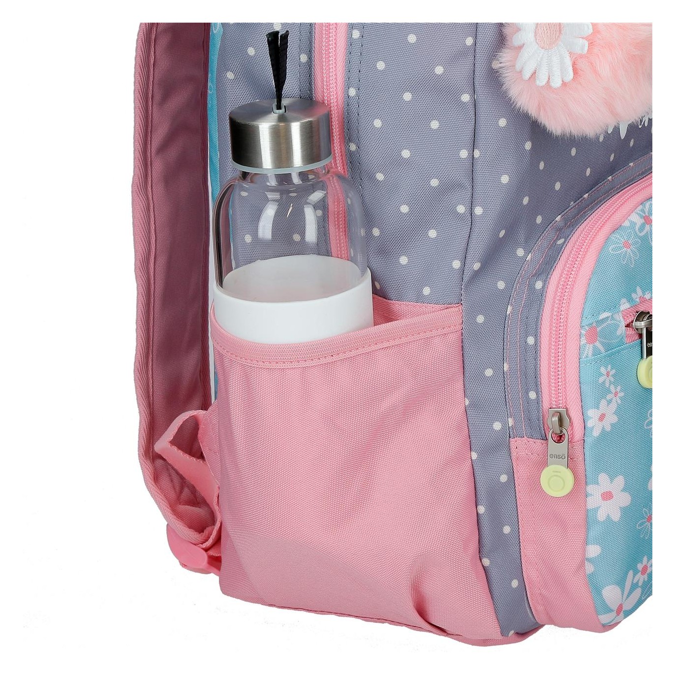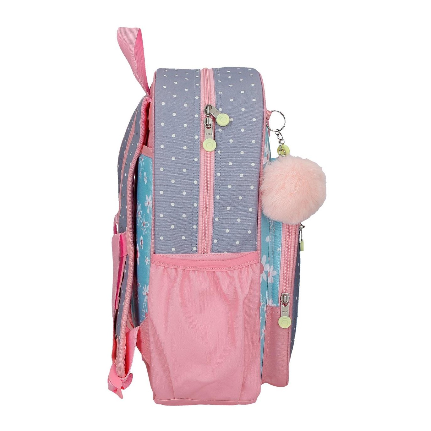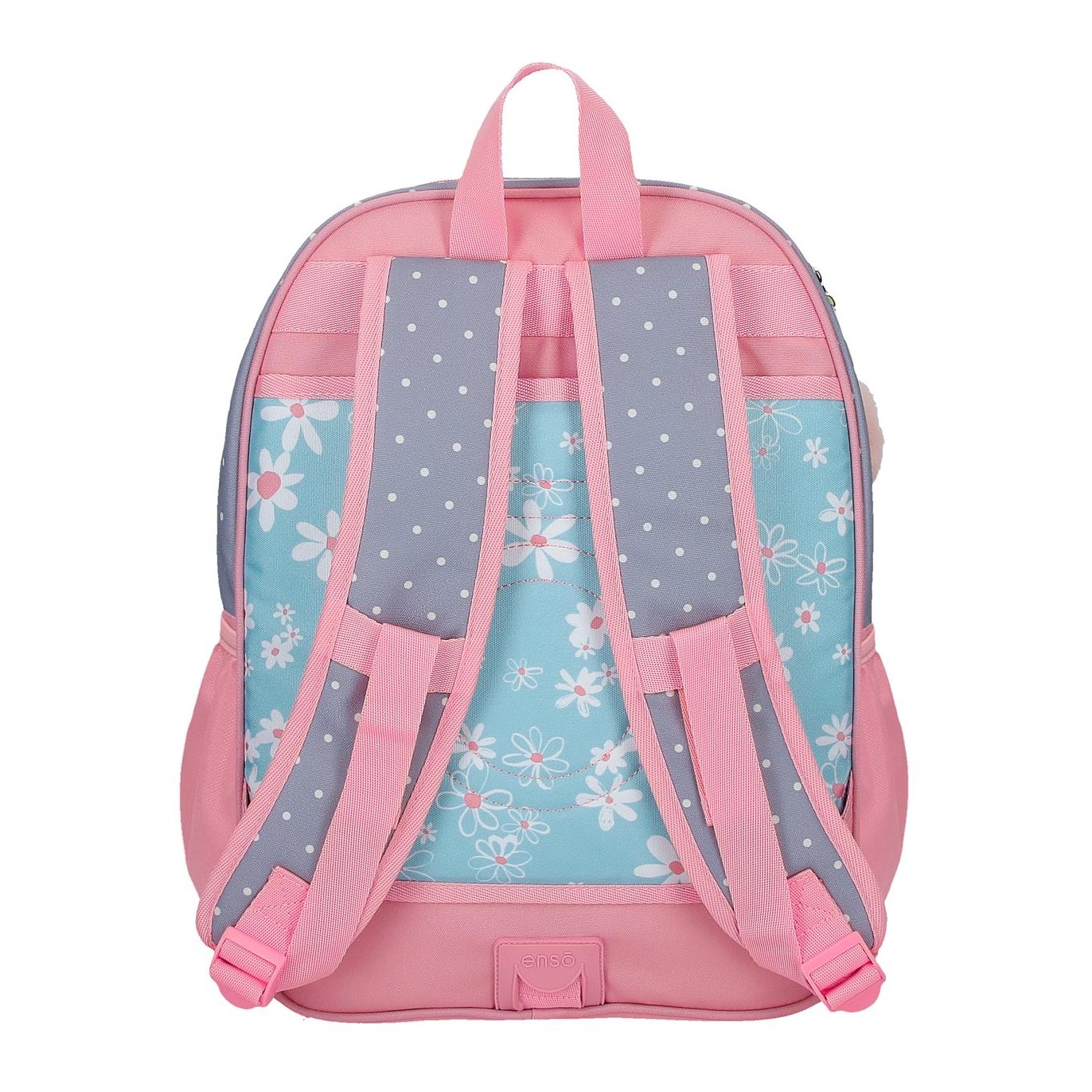 Ruksak je izrađen od poliestera. Dizajn jedne glavne pregrade s patentnim zatvaračem velikog kapaciteta za udobno nošenje knjiga, bilježnica i fascikli, između ostalog školskog pribora. Sa vanjske strane ima dupli prednji džep za najmanji školski pribor, a sa strane dva mrežasta džepa za flašu vode ili druge predmete. Gornja ručka za vješanje i široke, ergonomske i podstavljene naramenice koje se savršeno prilagođavaju leđima. Uključuje pompon privjesak za ključeve sa tratinčicom. Dimenzije: 30 x 38 x 12cm.