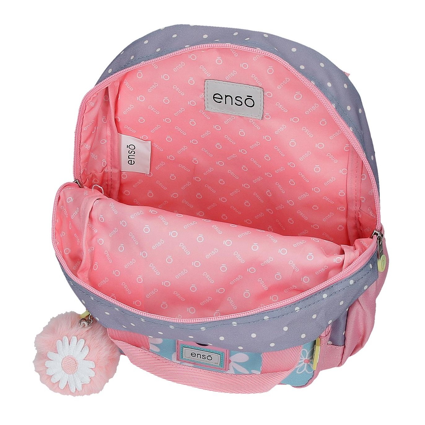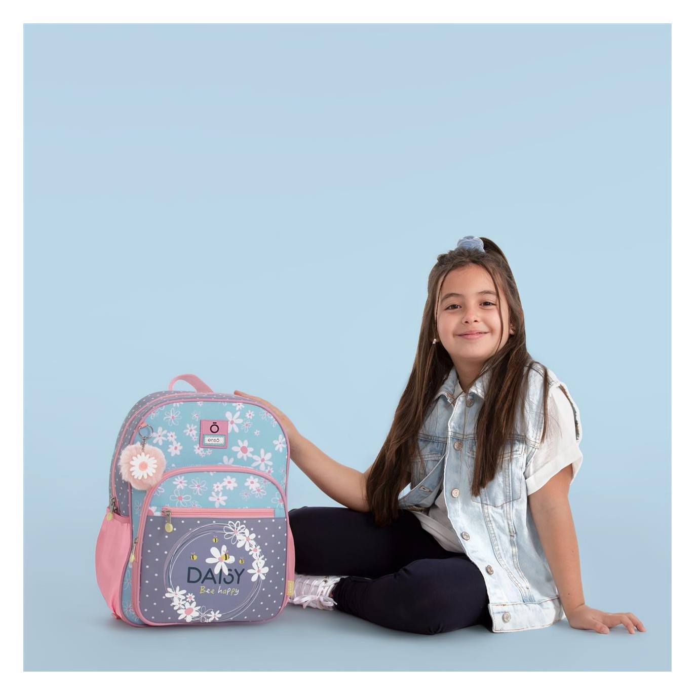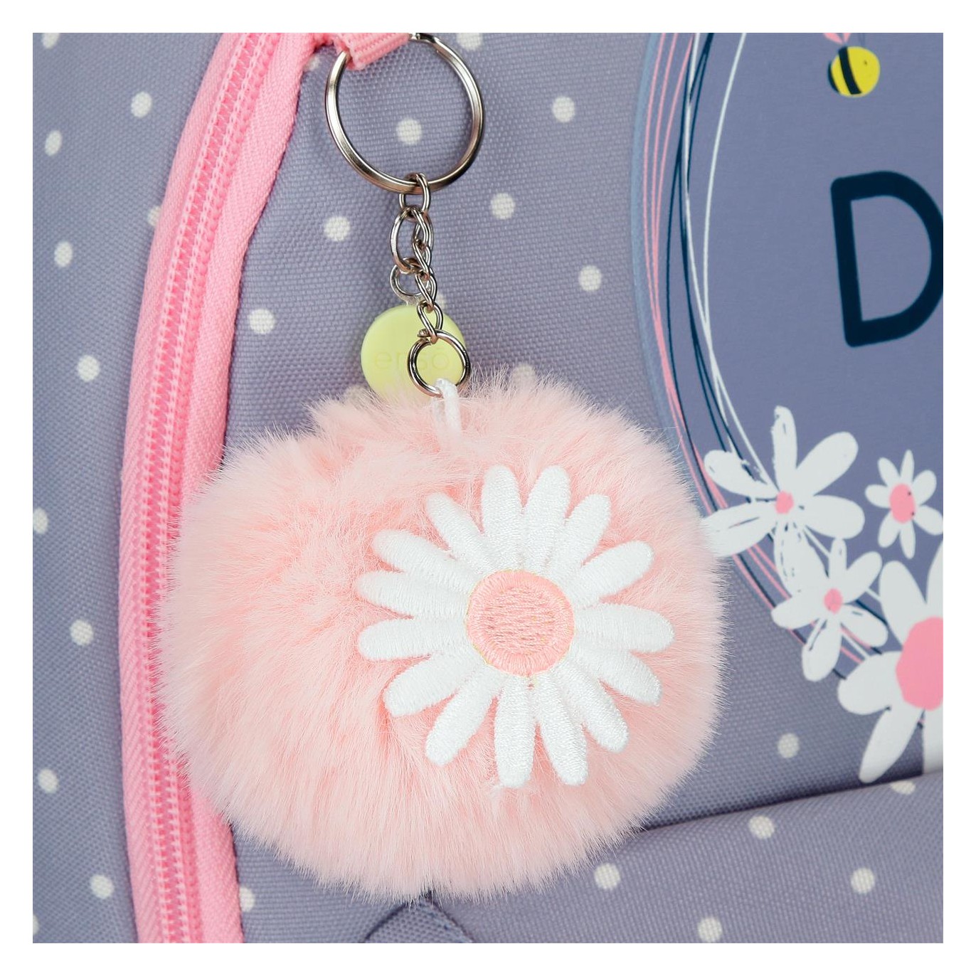 Ruksak je izrađen od poliestera. Dizajn jedne glavne pregrade s patentnim zatvaračem velikog kapaciteta za udobno nošenje knjiga, bilježnica i fascikli, između ostalog školskog pribora. Sa vanjske strane ima dupli prednji džep za najmanji školski pribor, a sa strane dva mrežasta džepa za flašu vode ili druge predmete. Gornja ručka za vješanje i široke, ergonomske i podstavljene naramenice koje se savršeno prilagođavaju leđima. Uključuje pompon privjesak za ključeve sa tratinčicom. Dimenzije: 30 x 38 x 12cm.