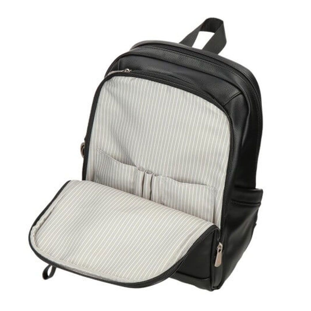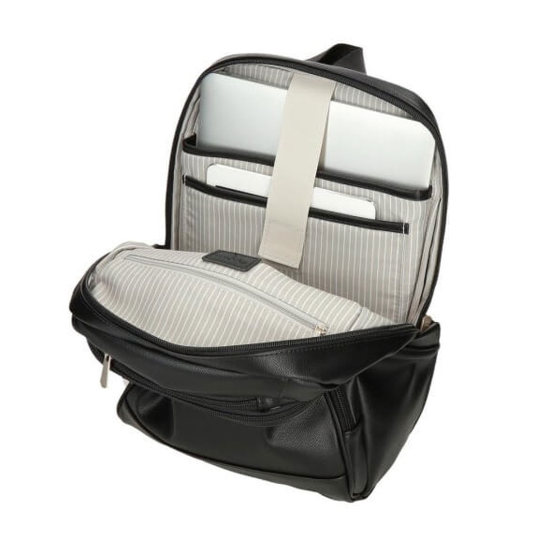 Ruksak izrađen od sintetičke kože. Glavni pretinac sa dva podstavljena džepa, jedan za računar do 13,3″ inča i drugi za tablet, i džep sa patent zatvaračem. Prednji džep sa patent zatvaračem za lak pristup najvažnijim dodacima. Široke, ergonomske i podstavljene naramenice koje se savršeno prilagođavaju stražnjem pojasu kako bi ih ugradile na kolica tokom putovanja. Dimenzija: 25x37x10 cm.