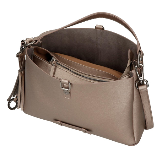Sintetička koža,posjeduje dodatnu tašnicu unutar torbe sa patent zatvaračem koja može da služi kao neseser. Kratka ručka i podesiva naramenica s karabinom za veći komfor i mogućnost nošenja kao torbe. Magnetno zatvaranje klikova.