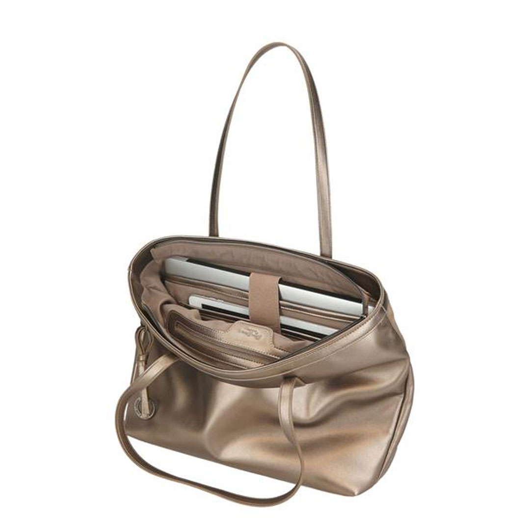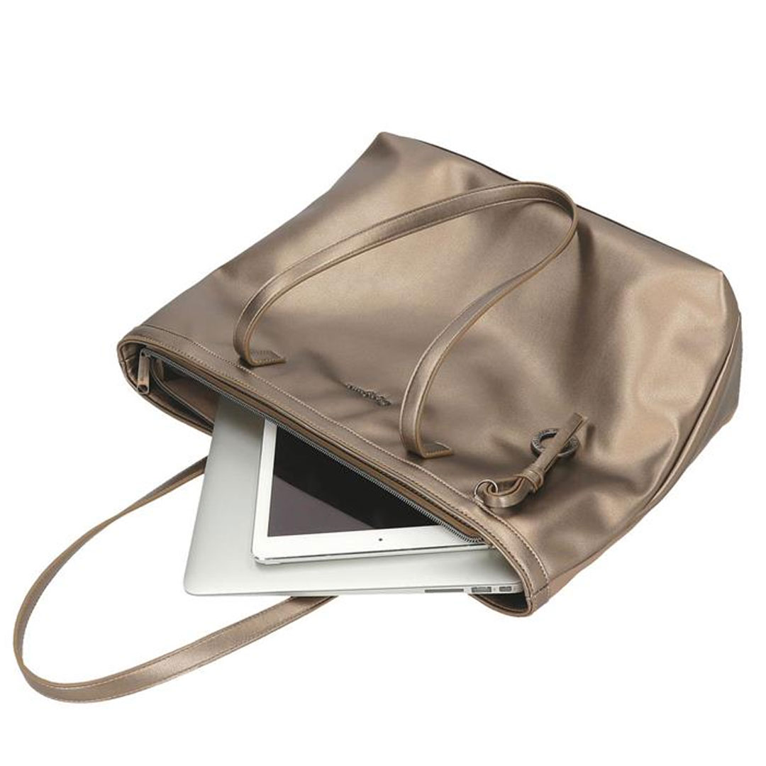 Ženska torba dimenzija 34 cm x 32 cm x 14 cm izrađena od poliestera i detalja od sintetičke kože. Dva posebna pretinca: jedan za računar do 15 inča i drugi za tablet do 10,2 inča. Sa dugom ručkom, idealnom za nošenje na ramenu