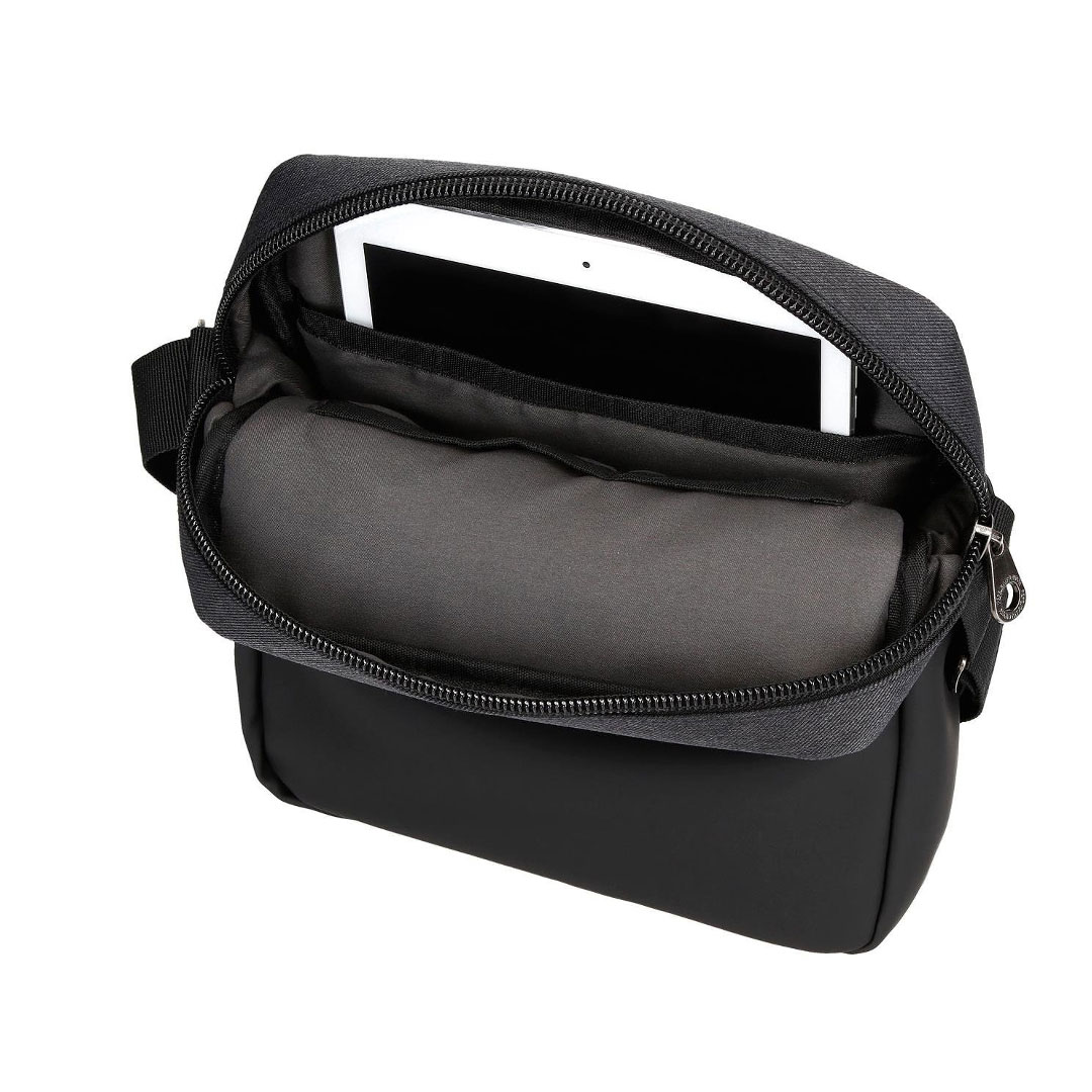 Torba na rame dimenzija 23 cm x 27 cm x 7 cm od poliestera i detalja od sintetičke kože. Glavni pretinac sa posebnim prostorom za odlaganje tableta. Jedan džep i dva otvora za odlaganje olovaka i sitnog pribora. Prednji džep i zadnji džep, oba sa patent zatvaračem za manje predmete. Podesivi remen za rame za veću udobnost. Izrađen od vodootpornih materijala.