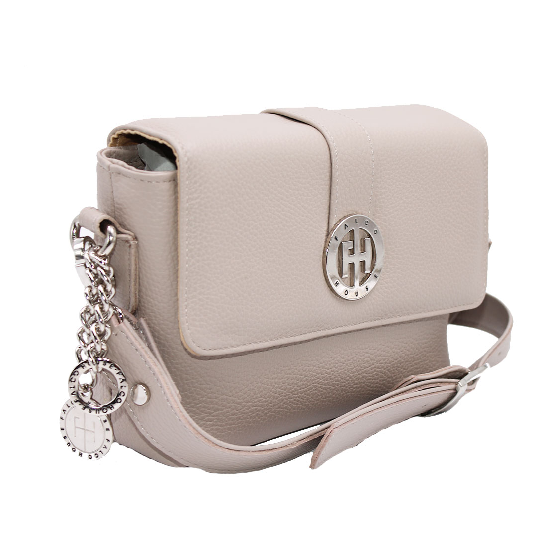 Tašna izrađena od kvalitetne prirodne kože. Veoma je praktična, sa dovoljno mjesta za najosnovnije. Ima dugačak metalni lanac sa kožnim dodatkom za ugodno nošenje. Lanac je podesiv na dvije veličine. Izgled tašne je upotpunjen brendiranim privjeskom. Dimenzija: 23x8x16 cm