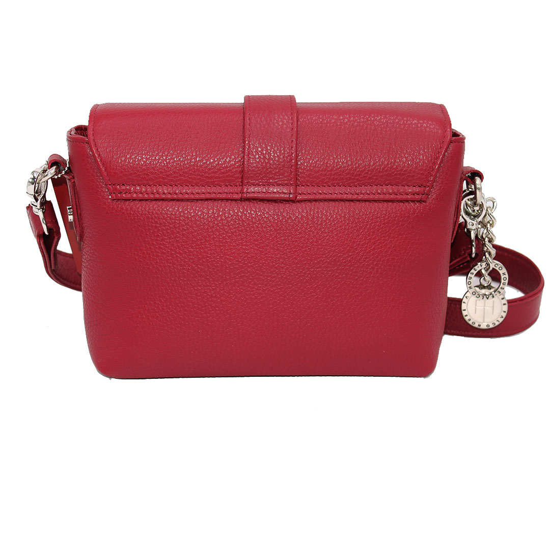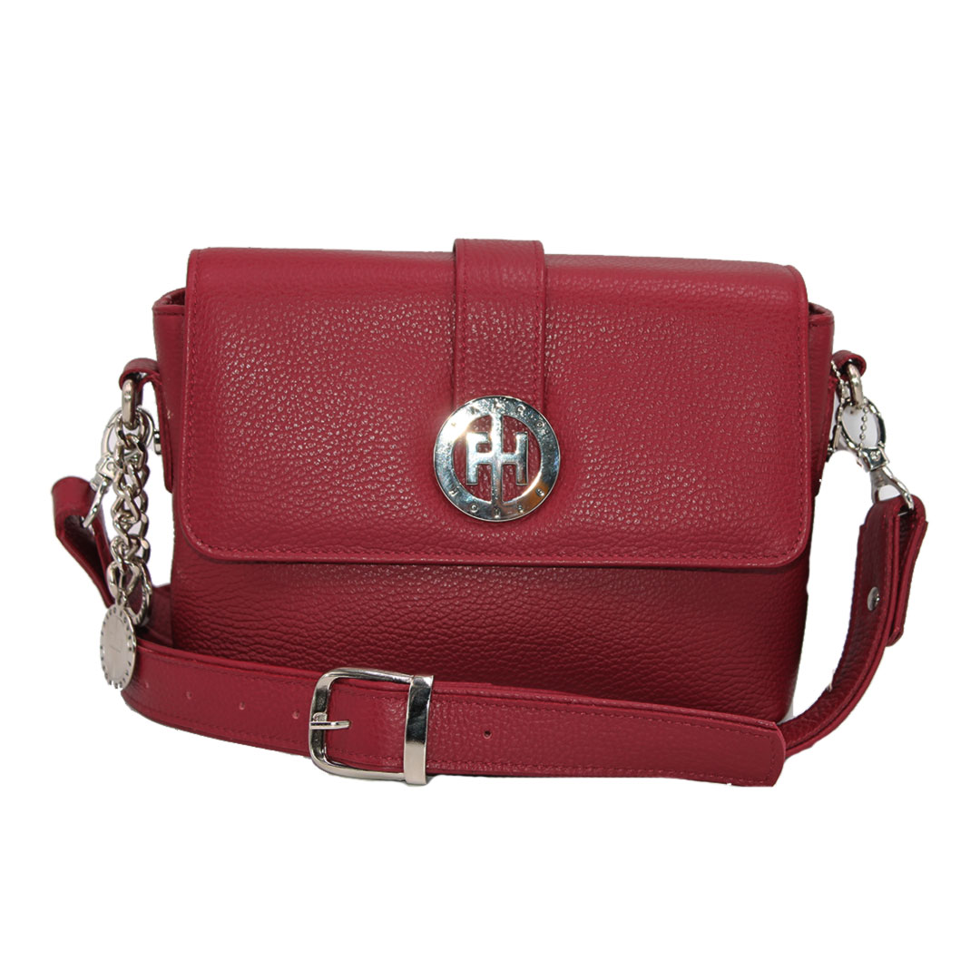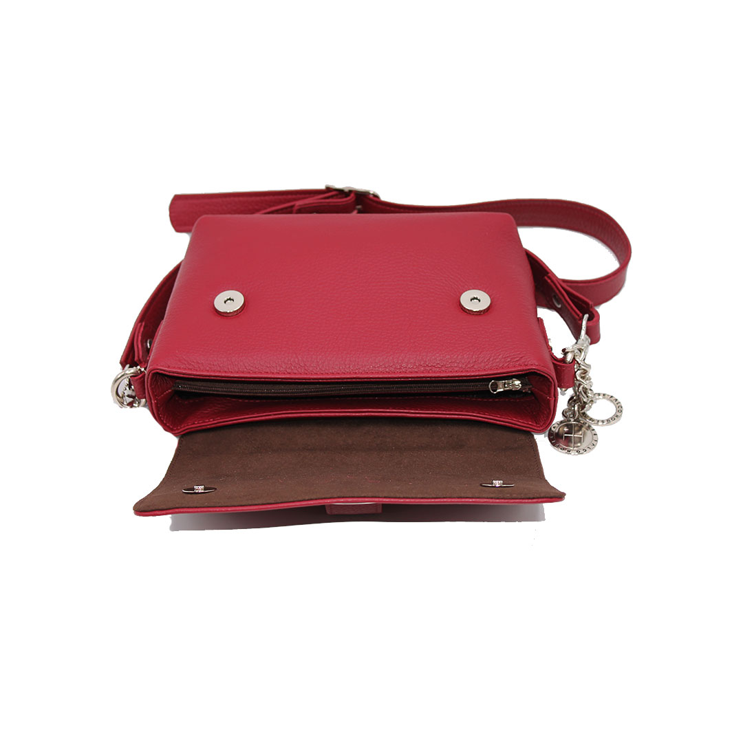 Tašna izrađena od kvalitetne prirodne kože. Veoma je praktična, sa dovoljno mjesta za najosnovnije. Ima dugačak metalni lanac sa kožnim dodatkom za ugodno nošenje. Lanac je podesiv na dvije veličine. Izgled tašne je upotpunjen brendiranim privjeskom. Dimenzija: 23x8x16 cm.